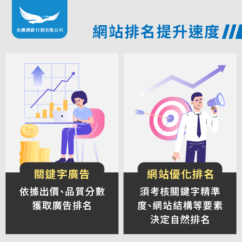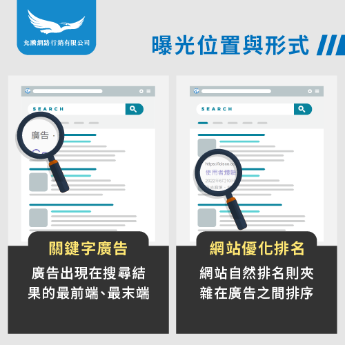 對於關鍵字廣告來說,每次點擊都是一次花費,若點擊後未進行購買或消費,對廣告來說效益就十分有限,因此若想將曝光品牌、提升品牌形象、提升流量、增加購買轉換等目標都寄託於關鍵字廣告上,是相當鉅額的開銷,且花費只會越來越高;然而網站自然排名優化,則屬於使用者自然搜尋、點擊,不僅更符合使用者的搜尋意圖,可以從更多不同類型的「長尾關鍵字(The Long Tail Keyword)」觸及使用者,建議企業把銷售轉換交給廣告,企業形象經營、流量獲取交給網站排名優化,更可以透過網站排名優化,使關鍵字廣告品質提高,無須區分兩者優劣,以相輔相成的方式將行銷成果最大化。